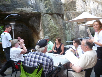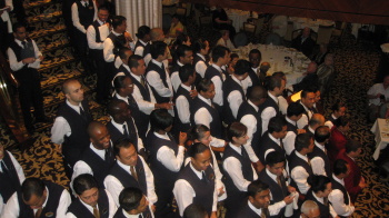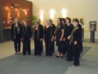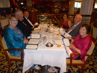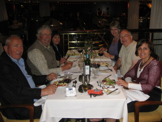 The evening entertainment was Black Tie. Described as a cabaret group, it comprised two brothers and their wives who entertained us with some wonderful singing and solos on piano and cello. The brothers were Con(stantine) and Uri. Con's wife Susie played cello while Uri's wife Valerie played piano. Susie saw Gill admiring her dress made by the brother's mother and they had quite a chat. The brothers were Australian of Russian parents, Valerie was from Sri Lanka and Susie was described as being of convict stock!