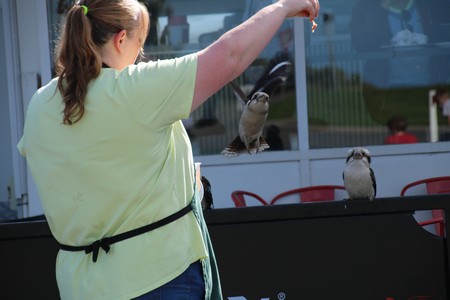 When we got to Captains At The Bay in Apollo Bay, Duncan (the owner) told us we could go back part way along Great Ocean Road and said we should. We went as far as Kennett River Holiday Park and the Kookaburra Cafe. One of the staff at the cafe was feeding the kookaburras strips of bacon and had them trained so that if they flew up vertically from the ground to the outstretched food before she signalled, they did not get the reward. They were trained like dogs!