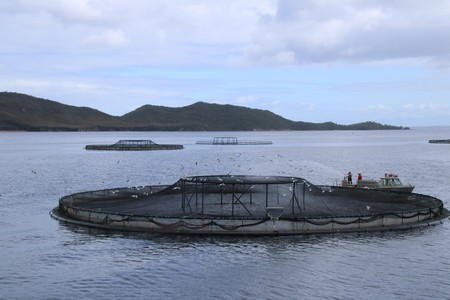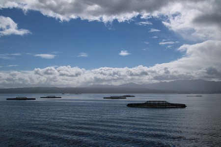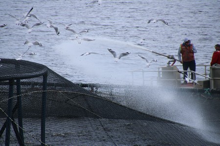 The boat pulled alongside a Petuna Fish Farm net and we saw the fish being fed with food in a water cannon. Petuna is one of three large companies and it was recommended that we look at their website for more information.