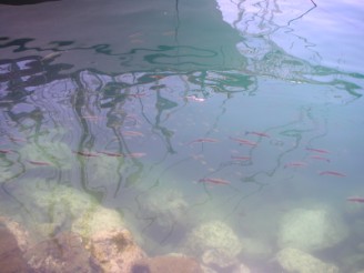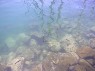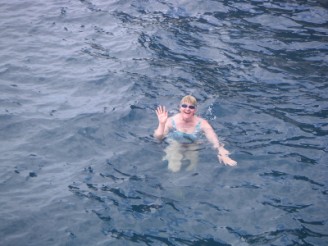 For the first hour or so I sat at the front of the boat. That is also the worst place to be in choppy water, which it was for a boat of this size. I have only once been travel sick on a on a sea-cat crossing of the English Channel when virtually everyone else was sick as well. However, my stomach did feel a bit unsettled so I took advice and sat inside at the back of the boat. Hence few photos. Fortunately I fairly soon recovered and enjoyed the excellent lunch provided. As you can see, Gill enjoyed the swimming stops.