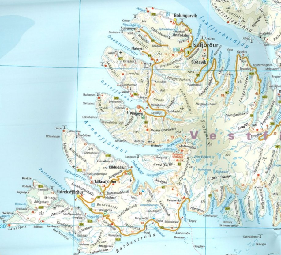 Starting from Reykjavik, we travelled up to Stykkisholmur from where we took the ferry to Brjanslaekur. The rest of our route while we were in the Western Fjords can be followed on the map below.