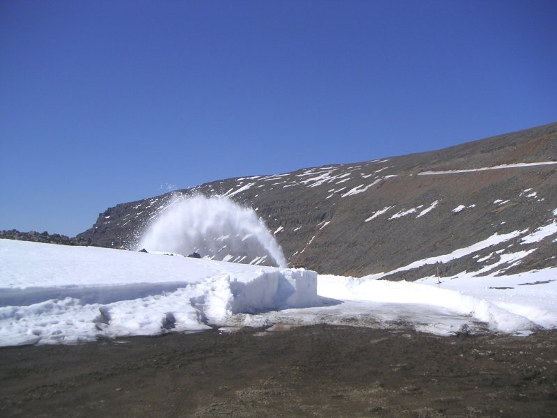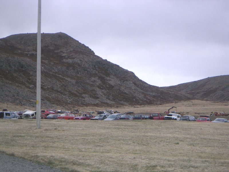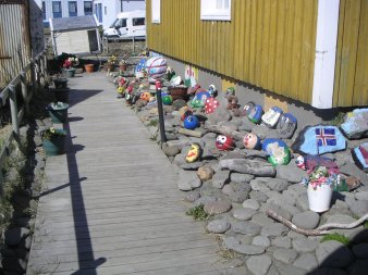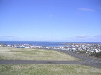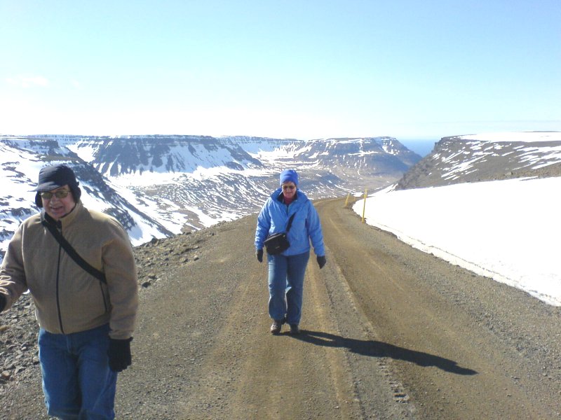 We then headed off to Bolungarvik. Now it is well known that the Icelanders have a strong belief in elves but one house we saw seemed to be home to many of them! The petrol station was also the local cafe as in so many places so we called in for a snack lunch and started chatting to the owner. He told us that the mountain we wanted to go up was closed to traffic but we could walk up in about an hour. That proved to be a tad optimistic but we estimated the climb to be about 1,200 feet so our hour and a half wasn't too bad. The views at the top were worth the effort, as indeed was the whole walk. At the top we chatted to someone who was clearing the road (not the photo below) and he explained that the location was a radio transmitting and tracking station. As we walked back down, he was leaving work behind the other two people working there and they very kindly stopped and drove us down in a rather nice Ford Expedition. Although we were on the track you see, the ride was as if we were on a motorway (interstate).