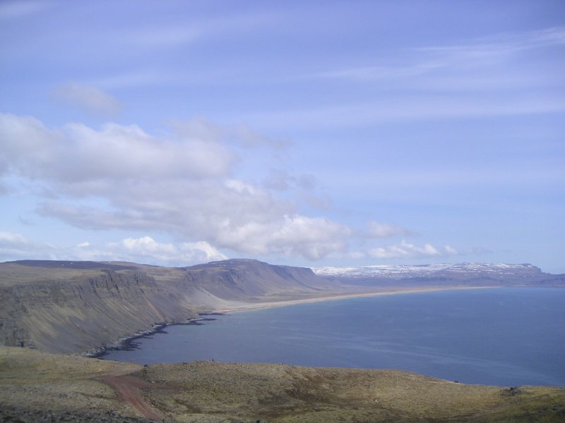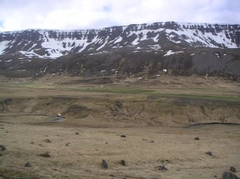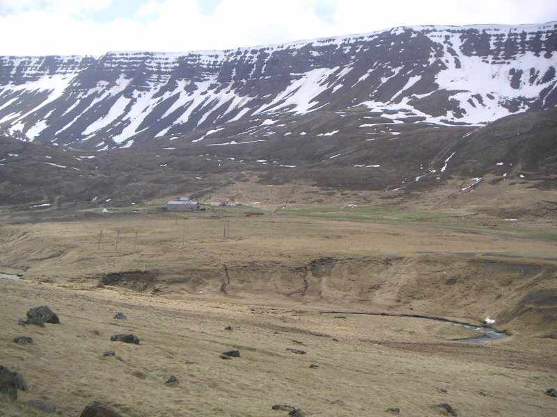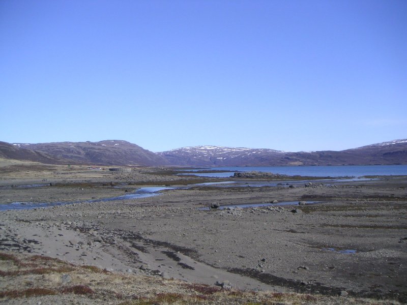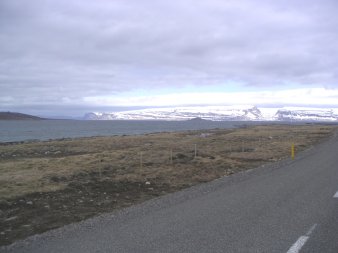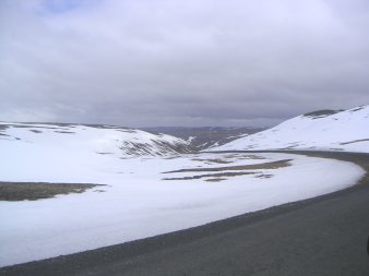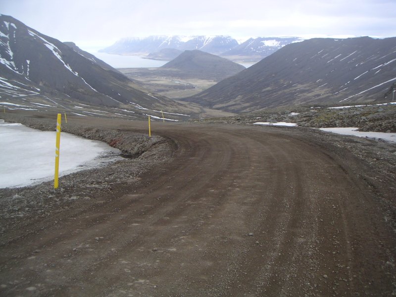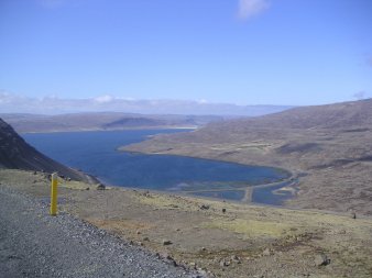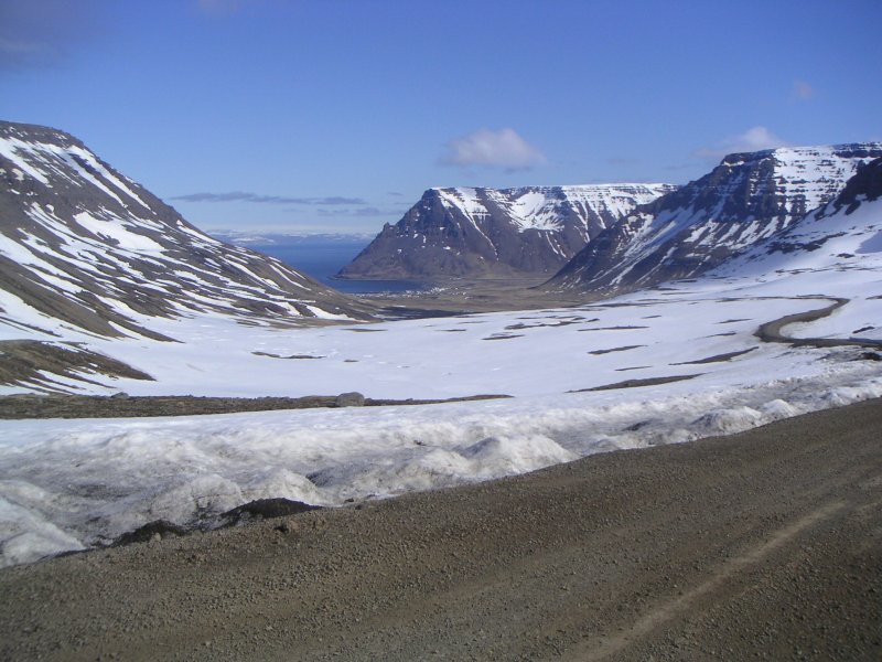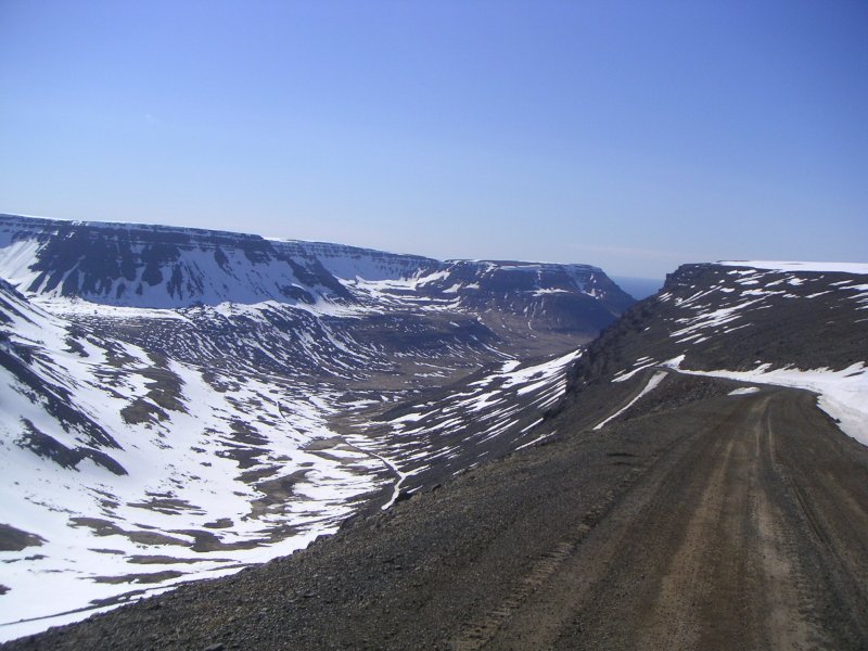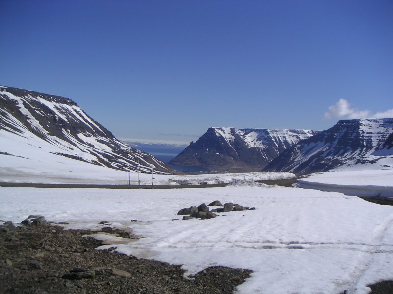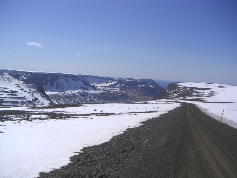We followed Route 61 from Isafjordur which follows the northern coast of the Western Fjords until it crosses the Steingrimsfjardarheidi (heidi being a pass) to Holmavik where we planned to stay overnight. This is one of those roads where you travel ten miles or so down one side of a fjord and ten miles back up the other side just to get one mile forward but what wonderful scenery. I mentioned the late melt earlier and that was even more evident on the Steingrimsfjardarheidi until we started dropping down the other side.