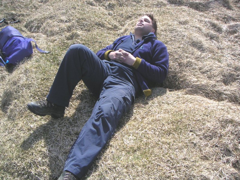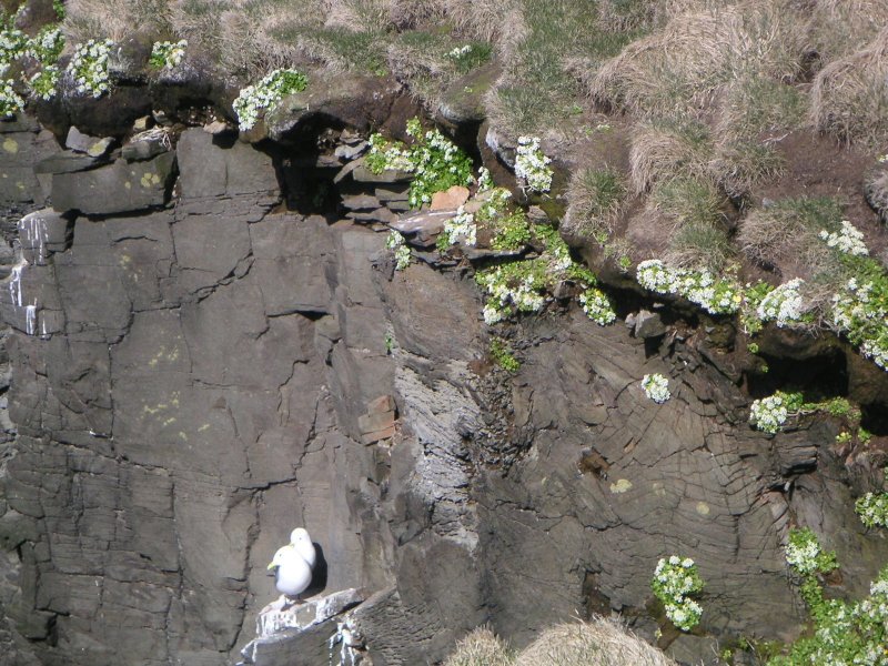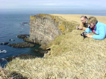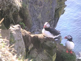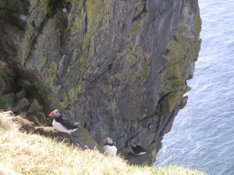 The bird cliffs were only lightly populated at this time of year and we did begin to wonder if we were going to see any puffins. They are such comical birds and very unafraid of humans. I saw on one site that if you crawl towards them on your stomach, you can sometimes stroke them. Fortunately we did find some as you can see below. We enjoyed a picnic lunch and laid in the sun for a while. It was surprisingly warm and we soon had to take off the fleeces that you see. In shirt sleeves it was a bit like sun bathing with air-conditioning to keep you cool.
