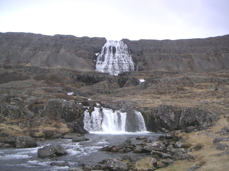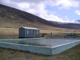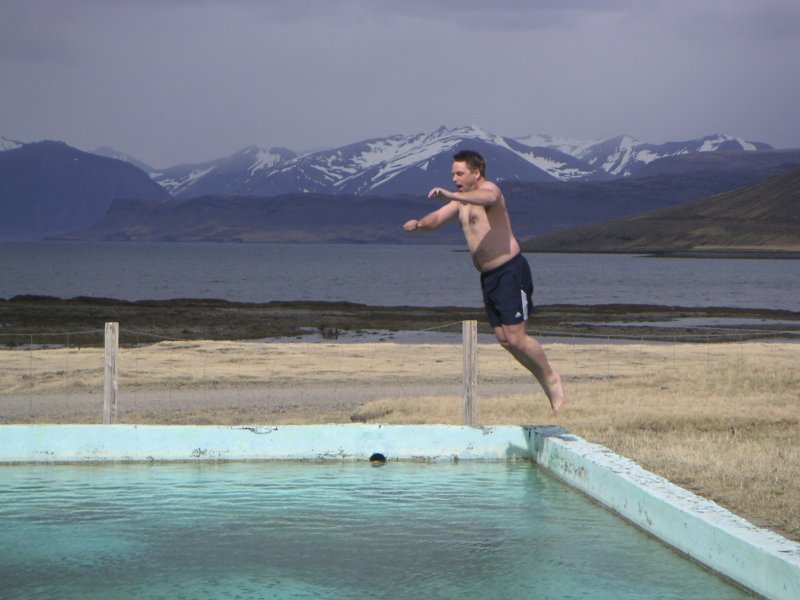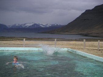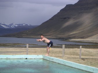 On a recommendation from Birna at the Breidavik, the first thing we did was to book our next stay at the Gamla Guesthouse which I will tell you more about later. Then it was just another day of magnificent scenery along Routes 612, 62, 63 (with a detour along the 617) and 60 to Pingeyri and Isafjordur. It would be so easy to get blase about this part of Iceland because it is all so beautiful. The first waterfall that you see below is not Dynjandi, it's just another waterfall along the way! Soon after that we came across a public outdoor pool in the middle of nowhere. Whilst the air temperature was a bit nippy, the water was wonderful. Tim did his Charles Atlas impression and with repeated cries of "sorry, I didn't get the right shot", I managed to get him to jump in four times before he cottoned on.